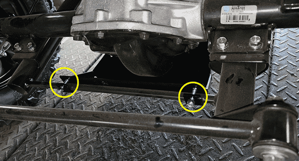 From the rear of the cart, align the slotted holes of the skid plate with the two loosened engine mounting bolts and slide under the nuts.